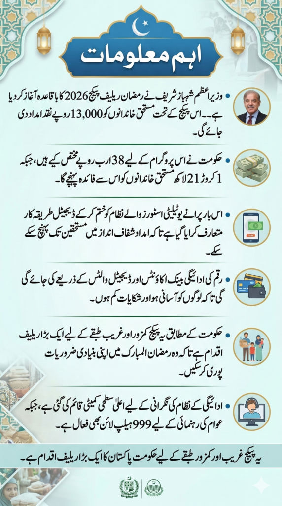 Eligible families will receive Rs.13,000 cash assistance under the Ramzan Relief Package 2026.