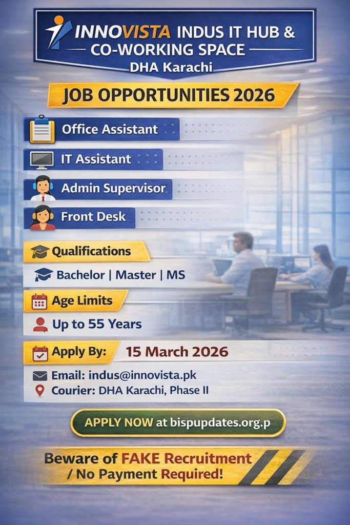 Innovista Indus IT Hub & Co-Working Space (DHA Karachi) has announced multiple contract-based jobs, including Office Assistant, IT Assistant, Front Desk, and Administration Supervisor/Coordinator. Each post has different age limits and experience requirements (Front Desk up to 30, IT up to 35, Office Assistant up to 45, Admin post 55).