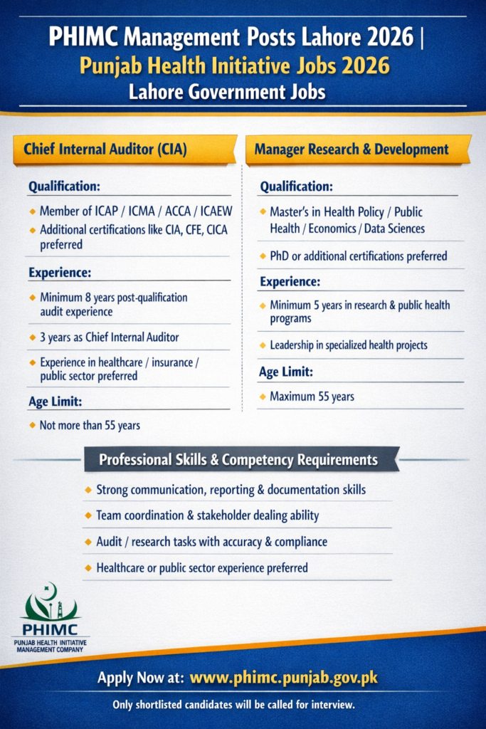 Punjab Health Initiative Management Company (PHIMC) has announced latest Government Jobs 2026 in Lahore under advertisement published on 27 February 2026. Applications are invited for senior-level management positions at PHIMC Head Office, Lahore.