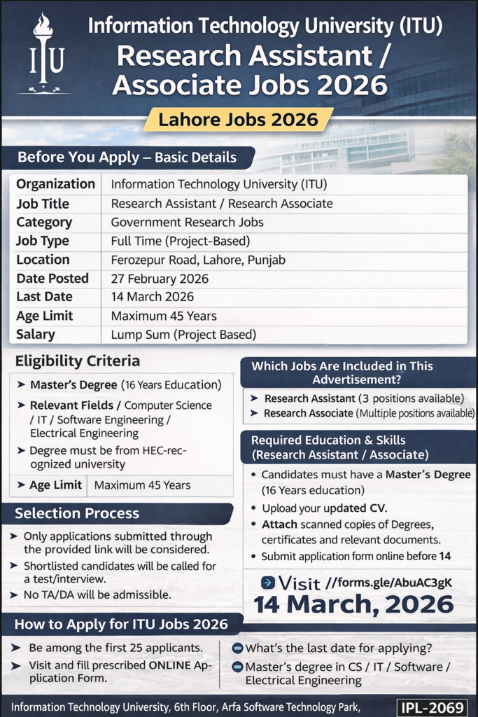 Information Technology University (ITU) Lahore has announced new government research jobs under an Externally Funded Project, as published in Express Newspaper on 27 February 2026. These vacancies are available at ITU, Ferozepur Road Lahore.